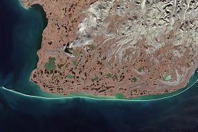 На снимке, принятом со спутника Sentinel 22 сентября 2024г. видна Коса Мээчкын на Чукотке.